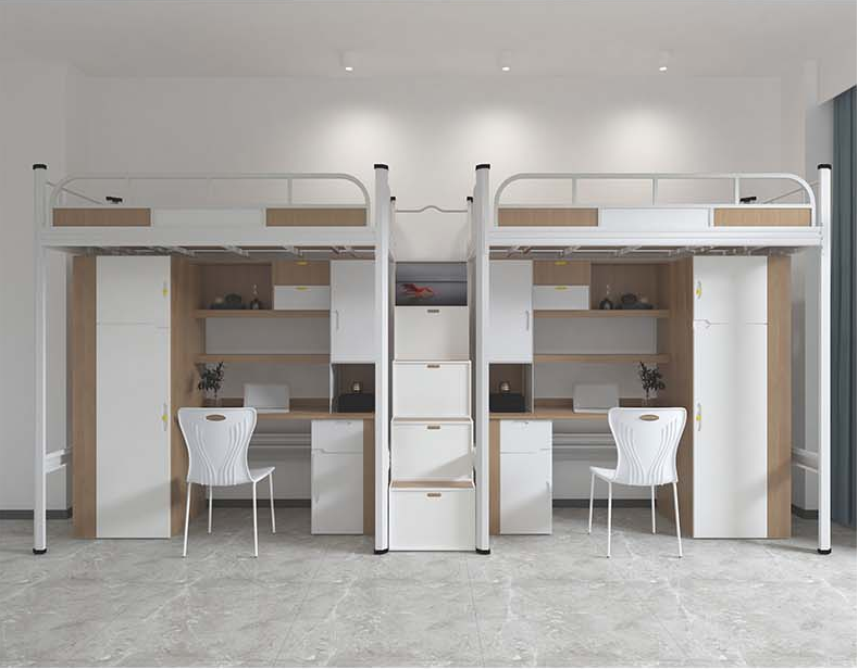 公寓床通常由床、?書柜、?衣柜、?書桌和梯架組成,?這種設計是為了適應學生公寓或小型居住空間,?通過合理的空間利用,?提供集學習、?休息、?儲物于一體的多功能家具解決方案。?公寓床的設計注重實用性和空間的有效利用,?常常出現(xiàn)在學生公寓或共享住宿環(huán)境中。?